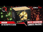 Dragon 25mm 40shots V-shape en kraftig multishot-cake med farverige stjerner og kraftige bomber, perfekt til et professionelt udseende fyrværkerishow.