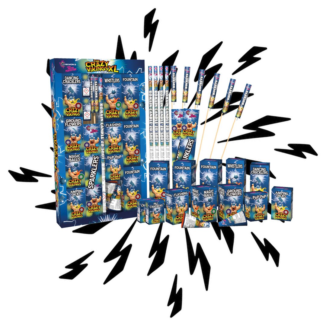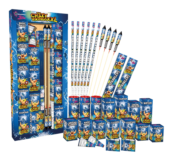 330 dele. Heksehyl, jordsole, knitrebolde, jumping jacks, knald perler, stjernekaster, små raketter, romerlys, blitlys mm.